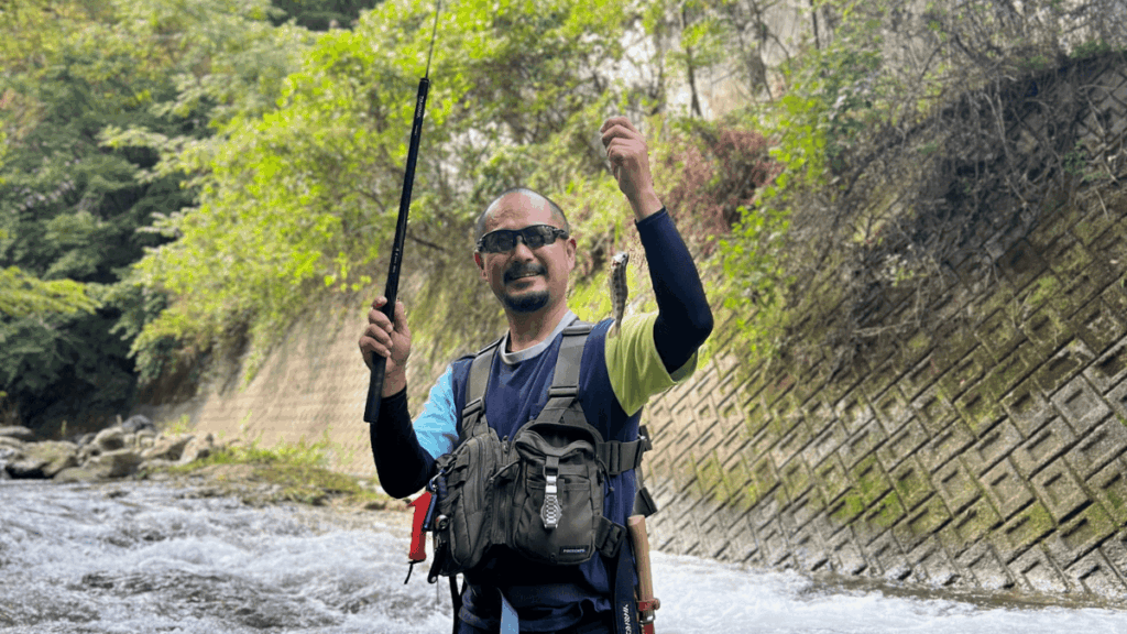 ウェーダーを履いて川に入り、のべ竿を手に提灯釣りで釣り上がっていく。